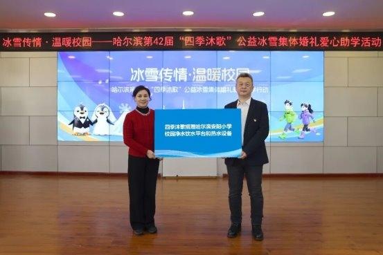 四季沐歌集團(tuán)公益慈善委員會(huì)主席吳典華(左一)向哈爾濱安陽小學(xué)捐贈(zèng)設(shè)備