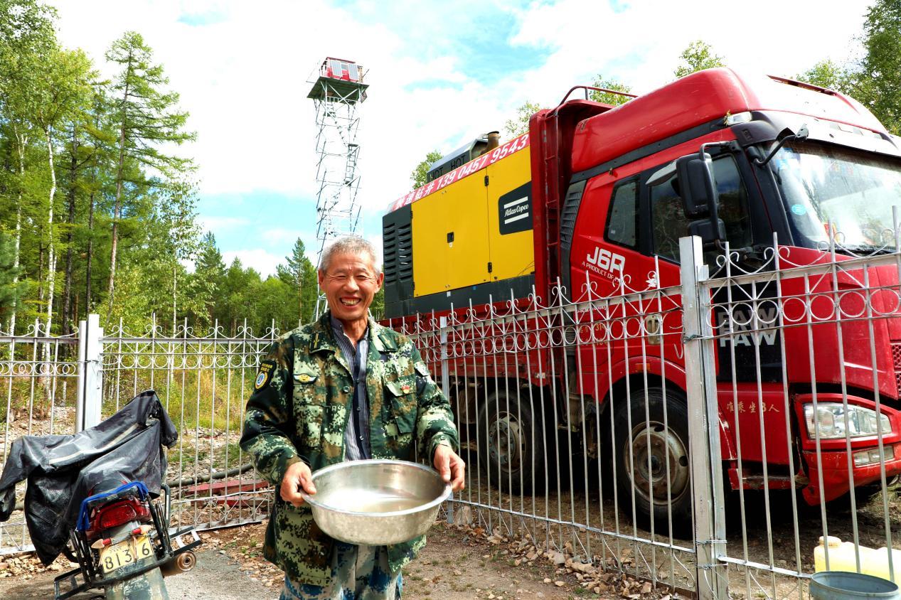“阿06”防火瞭望塔瞭望員樊學春端著剛打出來的水,笑得合不攏嘴(王力 攝)